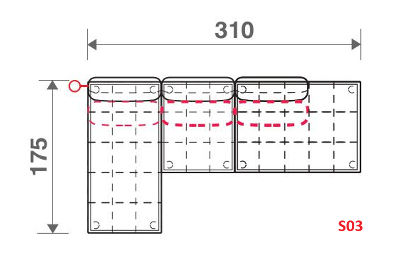 Elegantní a pohodlná sedací souprava dostupná ve přednastavených sestavách S03 a S04, s možností volby levého nebo pravého provedení rohu (Detailní zobrazení tohoto obrázku a rozměrů si můžete prohlédnout také v přiložených souborech ke stažení):