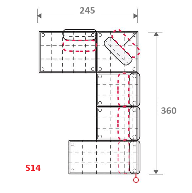 Elegantní a pohodlná sedací souprava dostupná ve přednastavených sestavách S13 a S14, s možností volby levého nebo pravého provedení rohu (Detailní zobrazení tohoto obrázku a rozměrů si můžete prohlédnout také v přiložených souborech ke stažení):